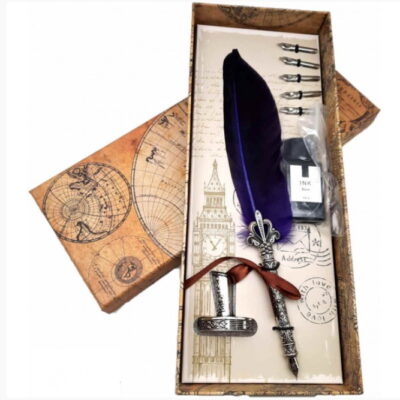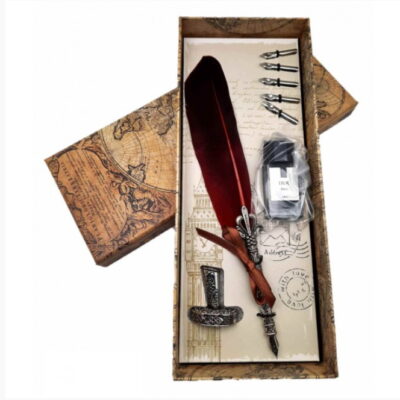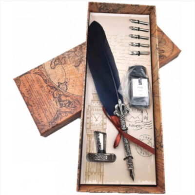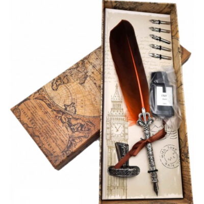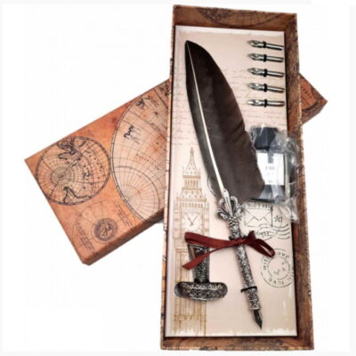 Antica penna stilografica con piuma vera e impugnatura in metallo lucido.