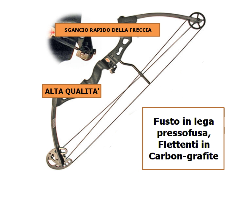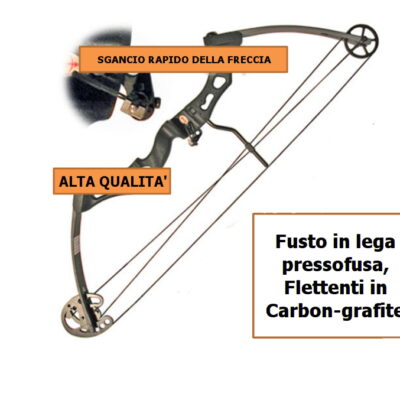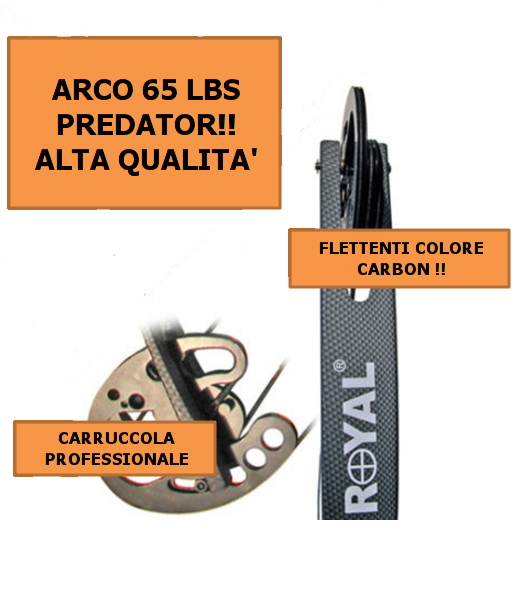 Arco compound professionale per destri, marca perfect line, modello predator, distribuito da royal, fusto in lega pressofusa, flettenti in carbon-grafite, peso 2000 gr, lunghezza cm 100, allungo corda 29″ colore carbon, carrucole in alluminio con perni e cam in acciaio, possibilità di variazione potenza/tensione/allungo corda, grazie ai diversi innesti per la corda, le varie regolazioni presenti sulla carrucola e il registro delle viti che reggono i flettenti (libraggio regolabile da 45 a 65 libbre) velocità di uscita della freccia 290 km/h
