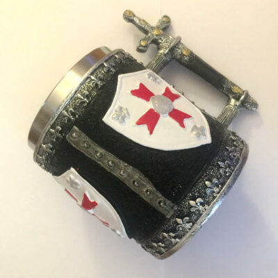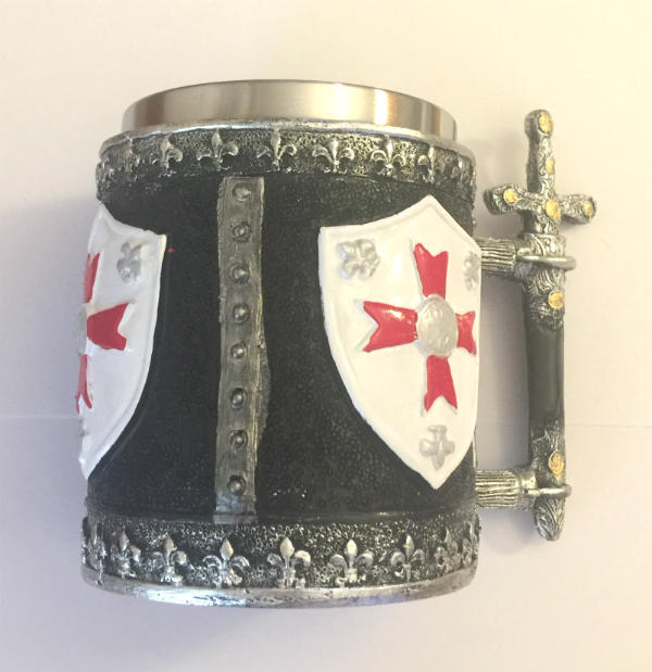 Nuovo boccale medievale da collezione con scudo bianco templare croce rossa e spada dai decori dorati come manico.
