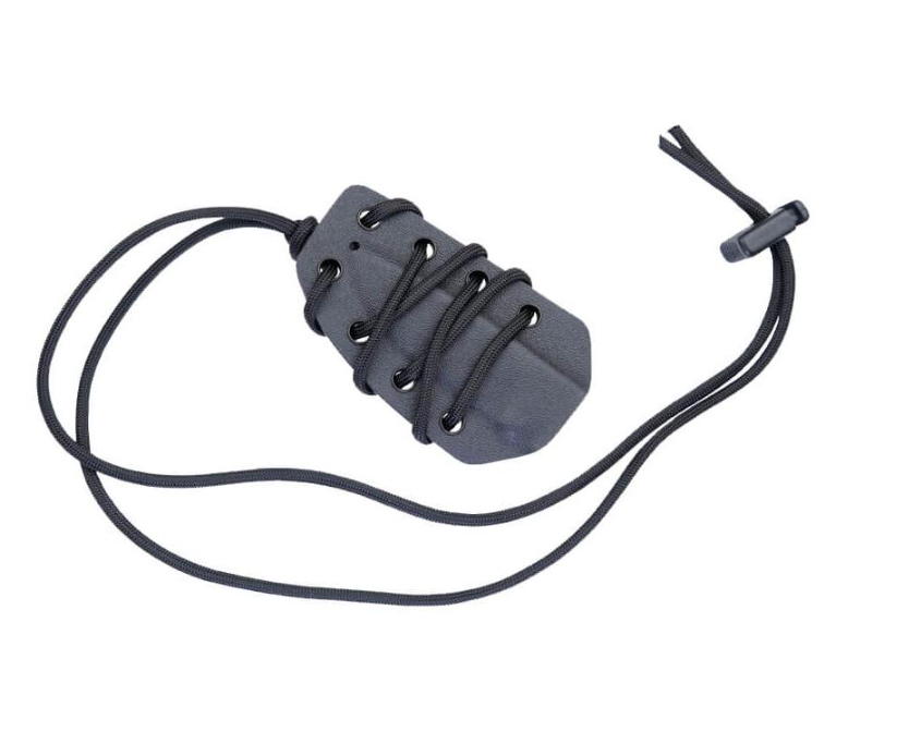 Gli occhielli metallici presenti sul fodero realizzato in Kydex pre-sagomato, permettono l’applicazione sia del cordino che del porta accessori.