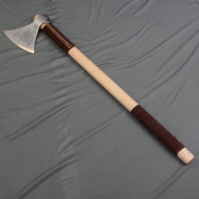 Ascia incisa realizzata in acciaio ad alto tenore di carbonio EN45 montata su una robusta impugnatura.