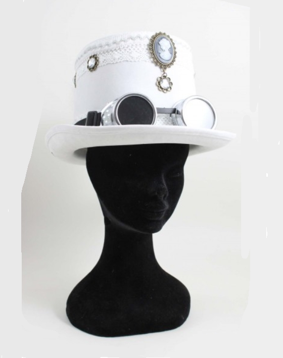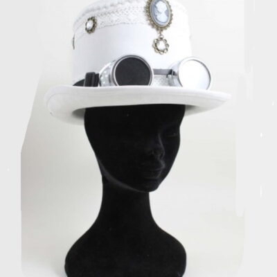 Cappello steampunk a cilindro bianco in feltro con occhialoni e applicazioni.