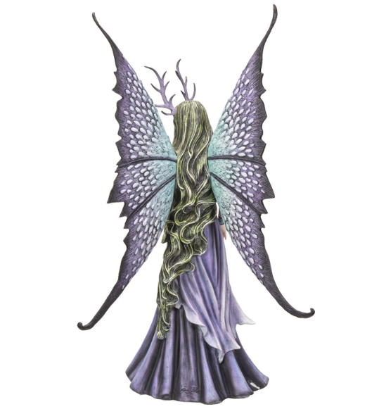 Bellissima fata della foresta dalle sfumature blu polvere e verde muschio con le ali intonate. I suoi capelli scendono lungo la schiena, quasi raggiungendo i suoi piedi, e un paio di corna completano il suo aspetto che richiama il bosco incantato.
