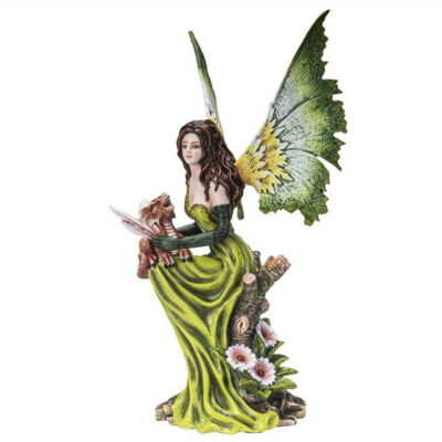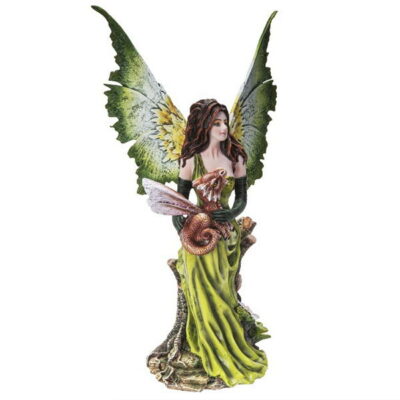Questa splendida fata dai toni del verde con grandi ali alle sue spalle tiene fermo tra le braccia un piccolo magico draghetto marrone.