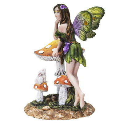 Questa piccola fata ha casa nella foresta, appoggiata sul cappello di un grande fungo, con un curioso coniglietto che la guarda dal basso. Indossa un vestito verde bosco, una borsetta marsupio viola attorno alla vita e un fiore tra i capelli dalle tonalità abbinate alle ali dietro di lei.