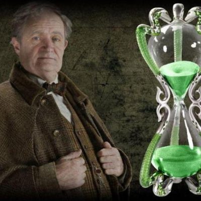 Replica della Clessidra del Professor Horace Lumacorno, realizzata in peltro e vetro, con all’interno sabbia verde brillante.