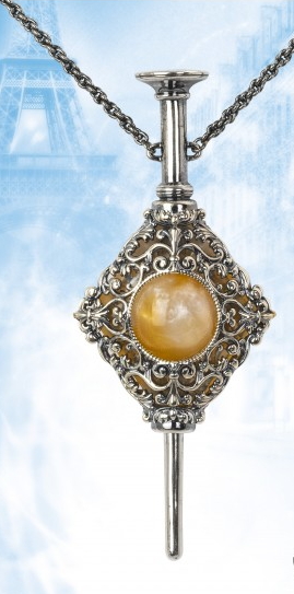 Replica del ciondolo di Gellert Grindelwald, realizzato in metallo placcato argento. Il ciondolo misura cm 7, mentre la collana cm 66 di lunghezza.