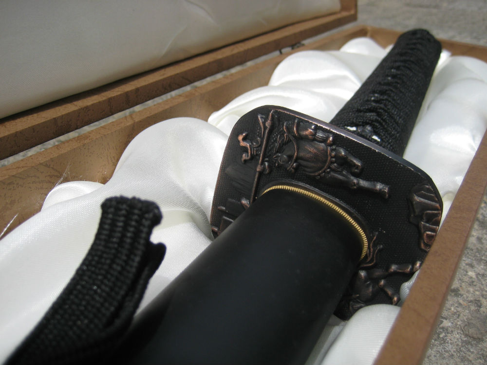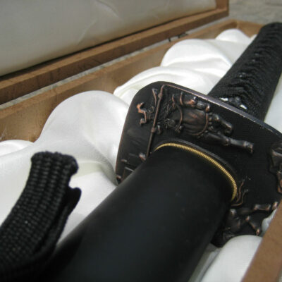 Impugnatura in metallo (anima interna in acciaio dolce) e tsuba con samurai a cavallo.