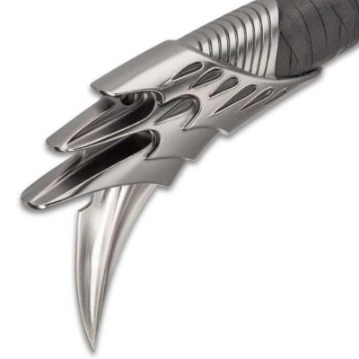 Ha una lama lucida lunga 50 cm in acciaio inossidabile 420J2, sul dorso rune incise, parti del manico in metallo massiccio e legno e un rivestimento del manico in vera pelle.