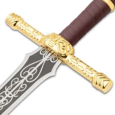 I dettagli ornati sulla lama le conferiscono un’aria di magnificenza sbiadita, mentre l’impugnatura rivestita in pelle marrone assicura una presa salda e confortevole.