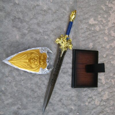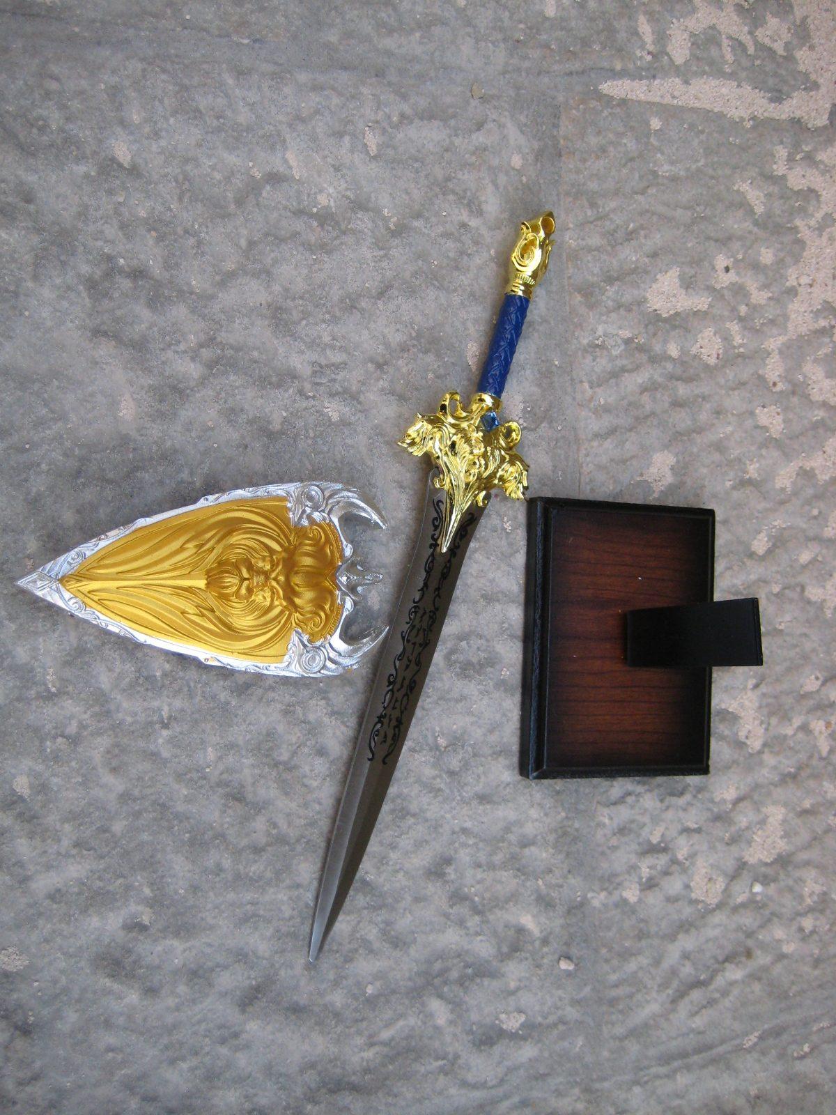 Mini spada abbinata allo scudo del mondo World of warcraft con espositore da appoggio in legno e supporto in metallo.