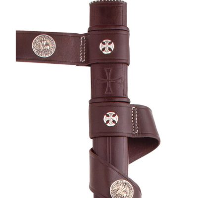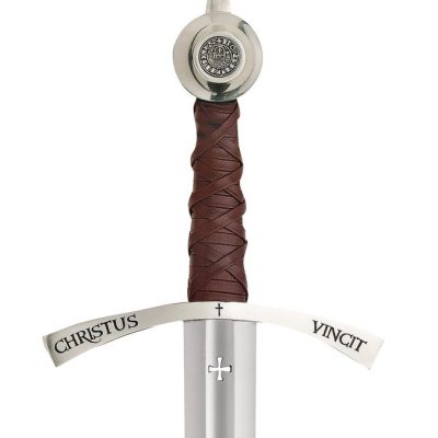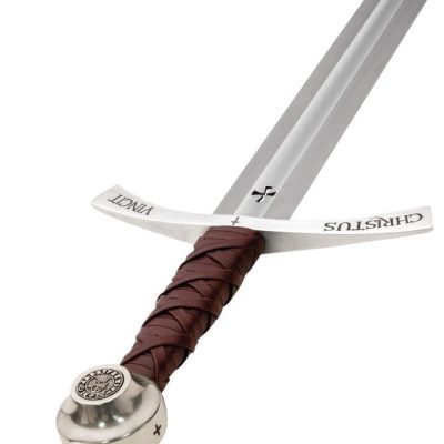 L’impugnatura in vera pelle avvolta a mano e le parti in acciaio massiccio rifinite a mano mostrano quanto sia veramente resistente e bella questa spada. Il pomolo presenta una moneta incastonata, un omaggio a Boemondo II, principe crociato di Antiochia, mentre la guardia della croce è incisa su entrambi i lati con la frase latina “Christus Vincit ~Christus Regnat” – “Cristo Conquista ~ Cristo Regna”. La lama in acciaio ad alto tenore di carbonio ha un profondo sguscio su entrambi i lati e una croce dei Cavalieri Templari.