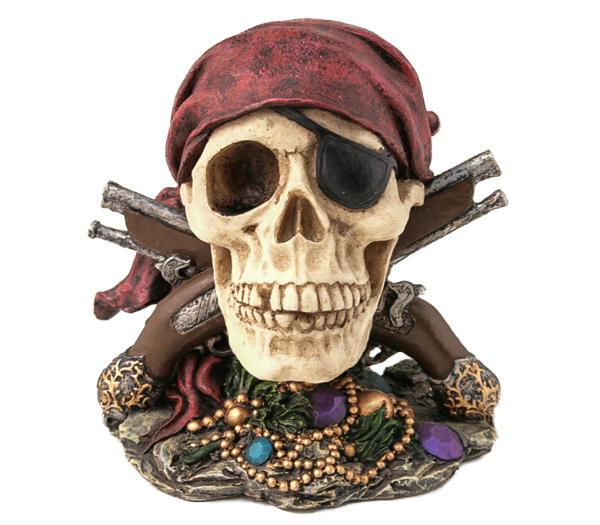 Teschio pirata da collezione in resina con pistole e gioielli.